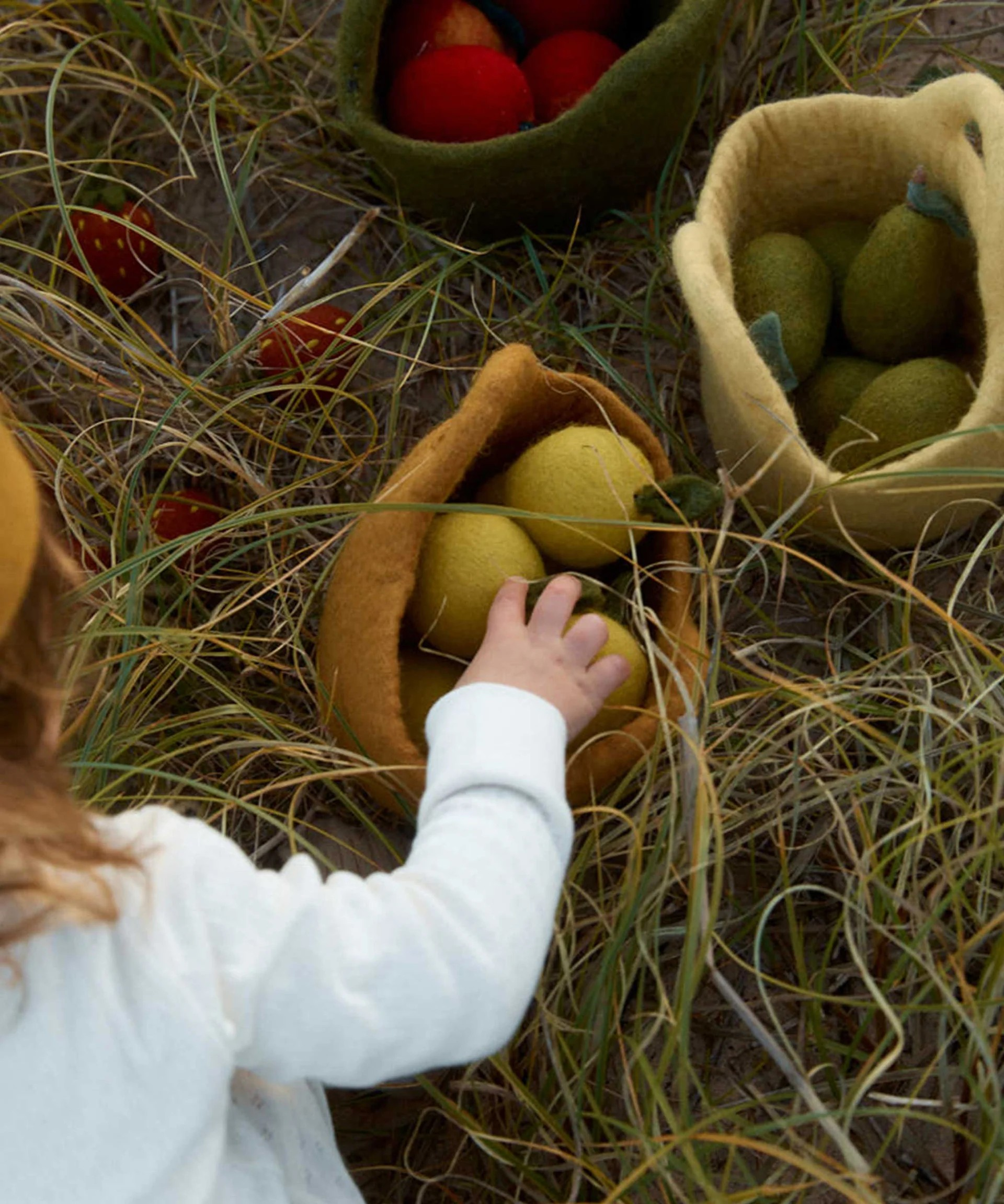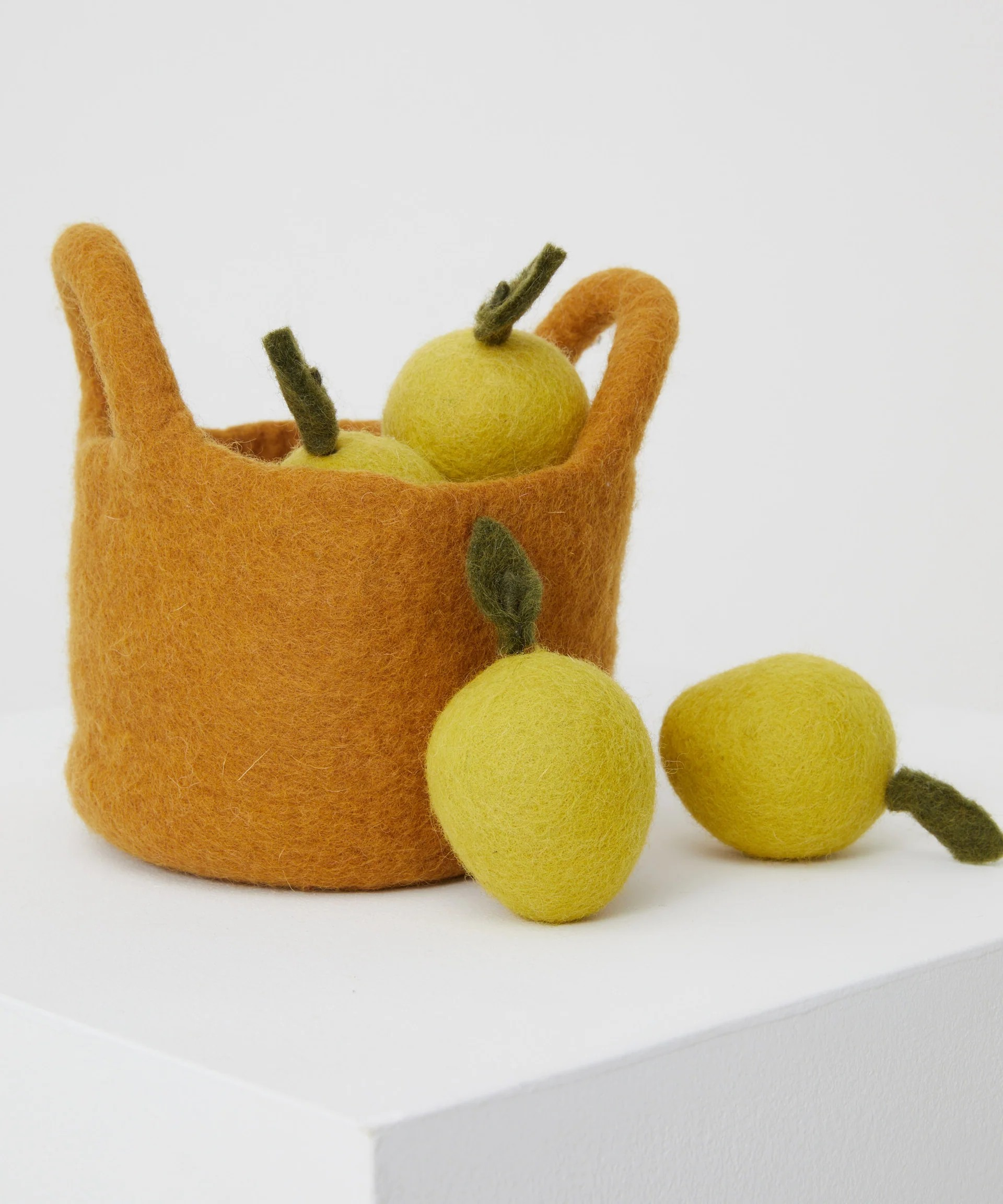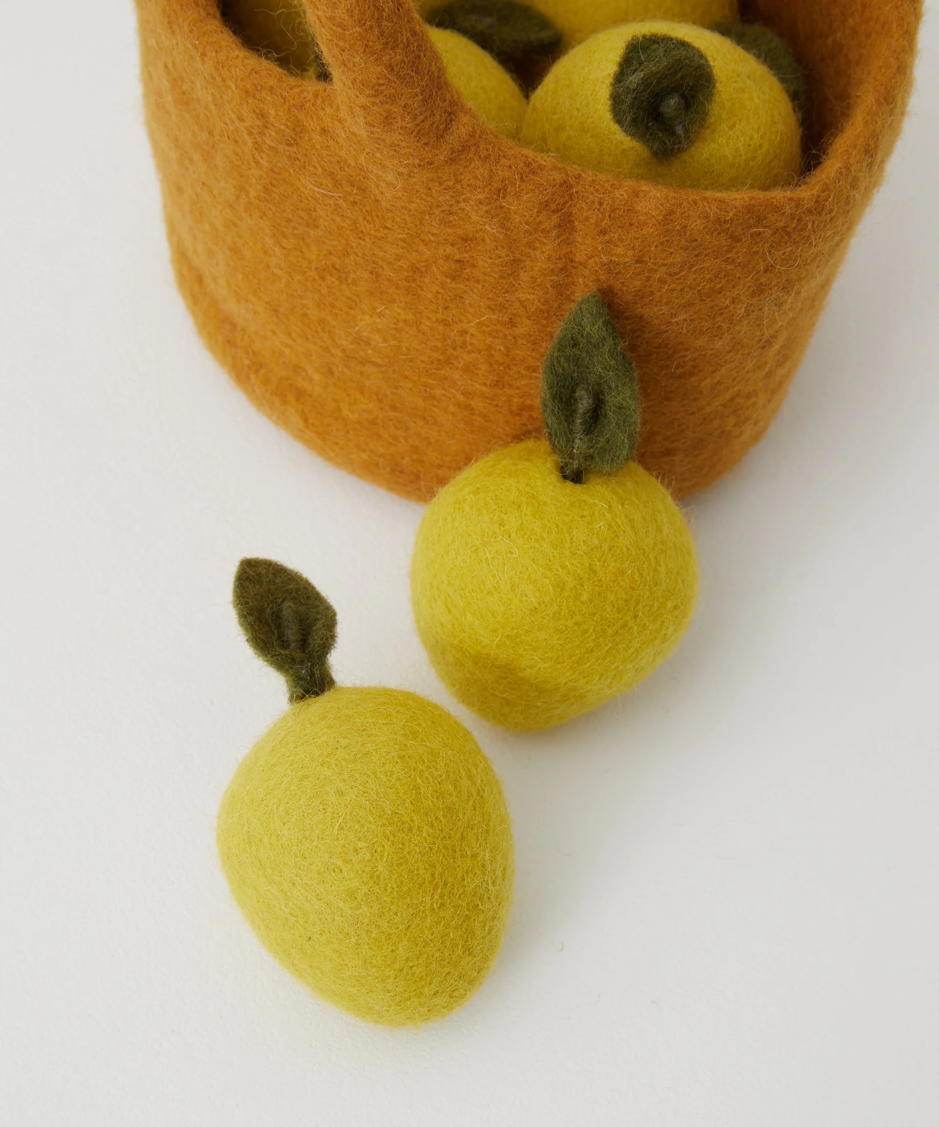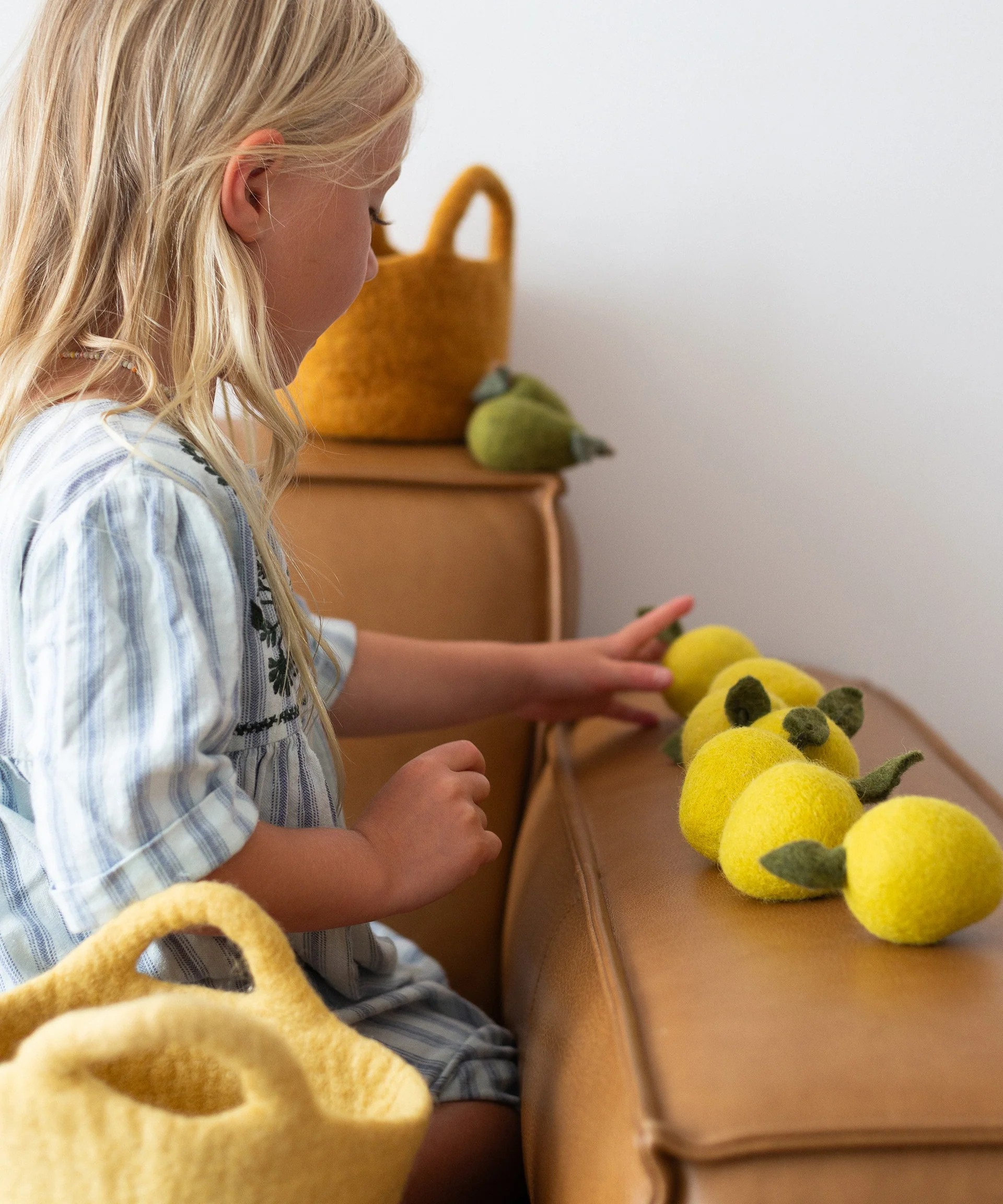 This golden basket features 7 juicy lemons nestled cozily inside, perfect for children of all ages. Each lemon is crafted from 100% felt wool, making them safe and tactile for little hands. The crate ensures easy storage and adds a touch of realism to playtime activities like market shopping or kitchen play. This eco-friendly set is ideal for encouraging imaginative play and learning about healthy eating in a fun, engaging way.