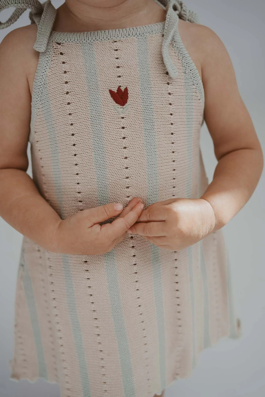 Soft, sweet, and made to grow with your little one—our Embroidered Pointelle Tie Dress in Mist Stripe is here to steal hearts!
