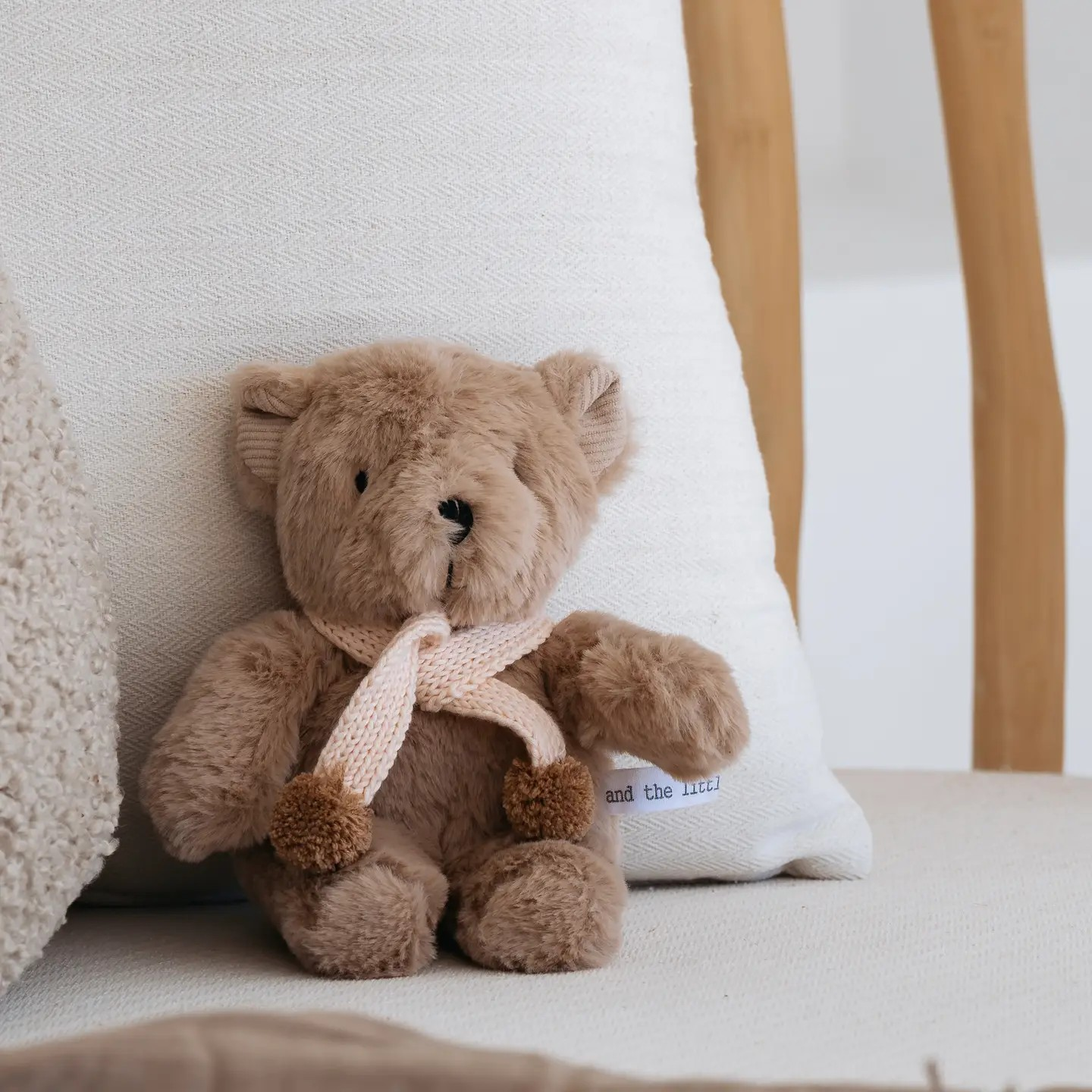 Prudence is made with the most divine caramel plush fabric and wears a knitted Australian merino wool blush pink scarf with chocolate pom poms.